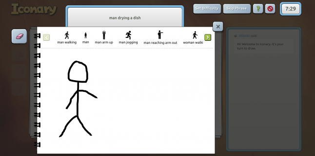 Iconary is actually available to try online, and prompts the player with guessing what the AI drew or vice versa. If the player chooses to draw, they’re asked to doodle the action provided and then select icons to represent their drawings.