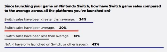Nearly 1 in 4 (24 percent) of respondents who had launched a game on Switch said it had sold better on Nintendo’s new console than on other platforms, while 20 percent said their Switch sales were average and 12 percent said their game actually sold worse on Switch than other platforms.