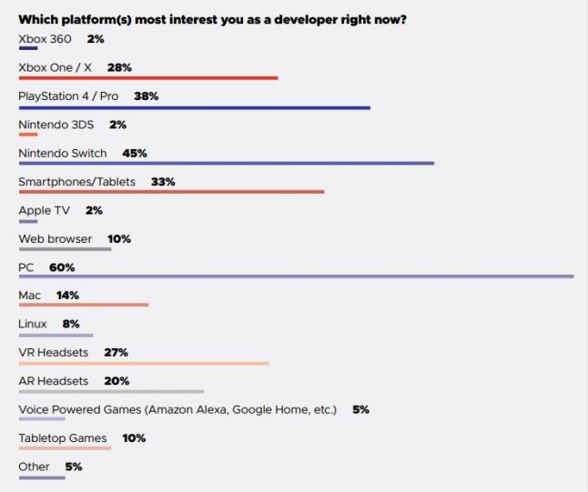 That’s significantly more dev focus on the Switch than we saw last year, when just 36 percent of respondents said they were interested in it. After a strong launch year, it seems Nintendo’s latest console has carved out a market for itself that interests more game makers than any other console.