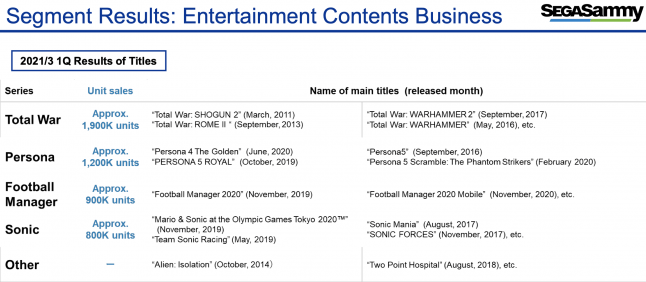 The Total War series was Sega’s best performer, bringing in 1.9 million sales during the quarter, while the Persona and Football Manager franchises amassed 1.2 million and 900,000 sales respectively. Sonic the Hedgehog, meanwhile, racked up approximately 800,000 sales.